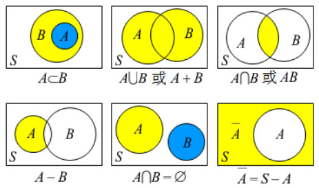 4 | 互斥(互不相容)事件 | 事件A与事件B不可能同时发生 | A∩B=∅ |