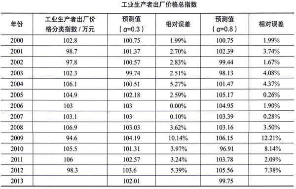 计算结果表明,α=0.3时,平均相对误差较小。预测2013年工业生产者出厂价格总指数为102.01(万元)