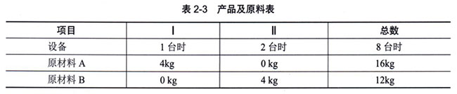 【例】某工厂在计划期内要安排生产I、II产品,已知生产单位产品所需设备台时及A、B两种原料的消耗。