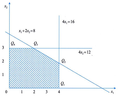 阴影区域中的每一个点(包括边界点)都是这个线性规划问题的解(称可行解),区域称为可行域。