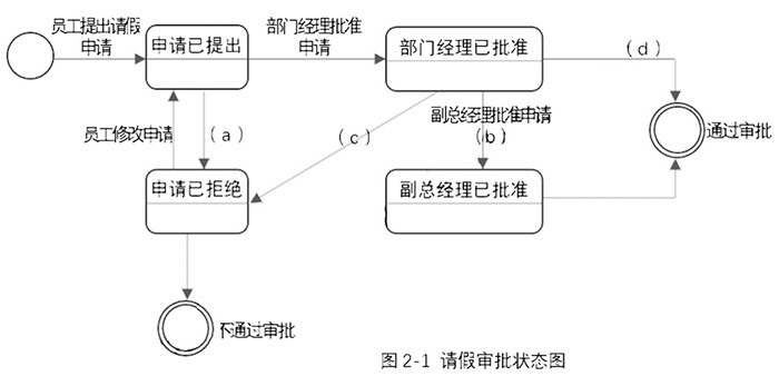 在面向对象的设计过程中,状态图描述了一个实体基于事件反应的动态行为。请根据题干描述,填写图2-1中的(a)~(d)空白,完成请假审批的状态图。