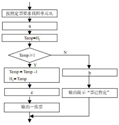 若某航空公司的飞机订票系统有n个订票终端,系统为每个订票终端创建一个售票终端的进程。假设Pi(i=1,2,…,n)表示售票终端的进程,Hj(j=1,2,…,m)表示公共数据区,分别存放各个航班的现存票数,Temp为工作单元。系统初始化时将信号量S赋值为(46)。Pi进程的工作流程如下,a、b和c处将执行P操作和V操作,则图中a、b和c应填入(47)。