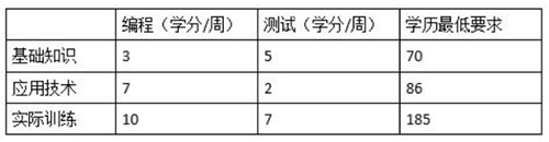 【56】某IT企业计划对一批新招聘的技术人员进行岗前脱产培训,培训内容包括编程和测试两个专业,每个专业要求在基础知识、应用技术和实际训练三个方面都得到提高。根据培训大纲,每周的编程培训可同时获得基础知识3学分、应用技术7学分以及实际训练10学分;每周的测试培训可同时获得基础知识5学分、应用技术2学分以及实际训练7学分。企业要求这次岗前培训至少能完成基础知识70学分,应用技术86学分,实际训练185学分。以上说明如下表所示: