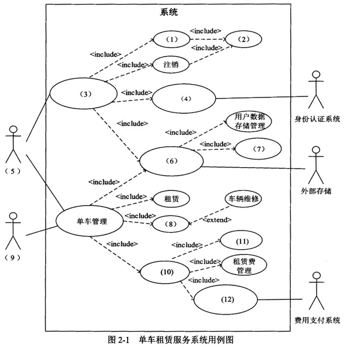 请分析下面A~Q所列出的共享单车租赁服务系统中的概念类及其方法,在图2-1所示用例图(1)~ (12)处补充所缺失信息。