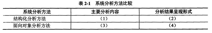 在系统分析阶段,结构化分析和面向对象分析方法主要分析过程和分析模型均有所区别,请将(a)~(g)各项内容填入表2-1(1)~(4)处对应位置。