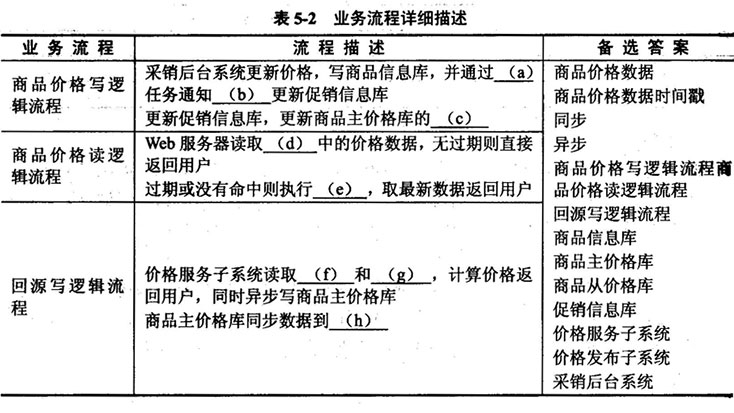 基于上述流程,系统设计人员进一步将业务流程细分为商品价格写逻辑流程、商品价格读逻辑流程和回源写逻辑流程三个部分。根据图5-1所示的业务流程和题干描述,从备选答案中选择正确的选项填写表5-2中的空(a)~(h),将解答写入答题纸的相应栏内。