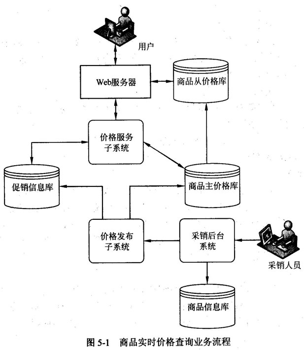 商品实时价格查询是该系统一个重要的业务场景,其完整业务流程如图5-1所示。其中商品实时价格由采销人员在后台设置,包括基础价格与促销信息(例如直降、打折等);用户在前台商品详情页面请求实时价格;商品实时价格则由商品的基础价格与促销信息计算得出。