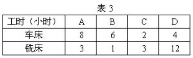 某车间需要用一台车床和一台铣床加工A、B、C、D四个零件。每个零件都需要先用车床加工,再用铣床加工。车床与铣床加工每个零件所需的工时(包括加工前的准备时间以及加工后的处理时间)如表3。