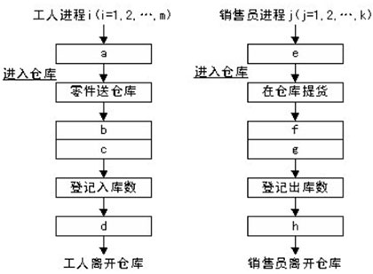 【40-42】某工厂仓库有一名保管员,该仓库可存放n箱零件。该工厂生产车间有m名工人,只要仓库空闲,工人将生产好的整箱零件放入仓库,并由保管员登记入库数量;该工厂销售部有k名销售员,只要仓库库存数能满足客户要求,便可提货,并由保管员登记出库数量。规定工人和销售员不能同时进入仓库,但是工人和工人,销售员和销售员可以同时进入仓库,其工作流程如下图所示。