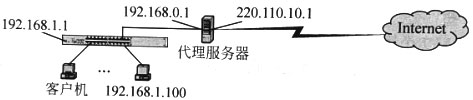 内部局域网中,客户机通过代理服务器访问Internet的连接方式如下图所示,在Windows操作系统中,(63)软件不能提供代理服务器功能。地址为192.168.1.100的客户机配置“TCP/IP网络属性”时,其中“网关”的设置内容应是(64)。该客户机访问Internet时,经由代理服务器后数据包的源地址为(65)。