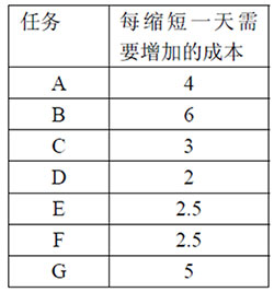 缩短一天,使成本增加最少。下表列出了各任务每缩短一天所需增加的成本。