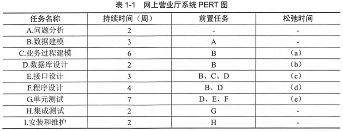 某软件企业为电信公司开发一套网上营业厅系统,以提升服务的质量和效率。项目组经过分析,列出了项目开发过程中的主要任务、持续时间和所依赖的前置任务,如表1-1所示。在此基础上,绘制了项目PERT图。