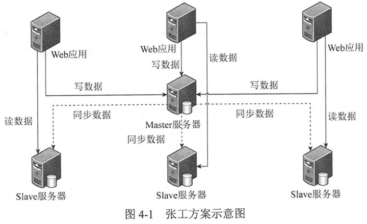 张工提出对MySQL数据库进行扩展,采用读写分离,主从复制的策略,好处是程序改动比较小,可以较快完成,后续也可以扩展到MySQL集群,其方案如图4-1所示。李工认为该系统的诸多功能,并不需要采用关系数据库,甚至关系数据库限制了功能的实现,应该采用NoSQL数据库来替代MySQL,重新构造系统的数据层。而刘工认为张工的方案过于保守,对该系统的某些功能,如关注列表、推荐列表、热搜榜单等实现困难,且性能提升不大;而李工的方案又太激进,工作量太大,短期无法完成,应尽量综合二者的优点,采用Key-Value数据库+MySQL数据库的混合方案。