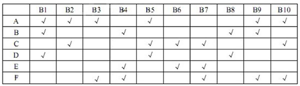 【56】某学院10名博士生(B1~B10)选修6门课程(A~F)的情况如下表(用√表示选修)所示。