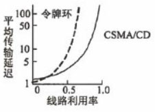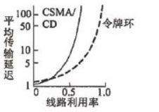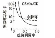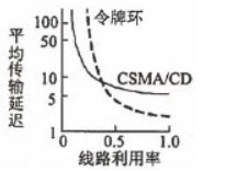 正确地表现了CSMA/CD和令牌环两种局域网中线路利用率与平均传输延迟的关系的图是