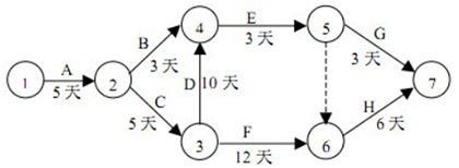 某工程计划如下图所示,图中标注了完成任务A-H所需的天数,其中虚线表示虚任务。经评审后发现,任务D还可以缩短3天(即只需7天就能完成),则总工程可以缩短